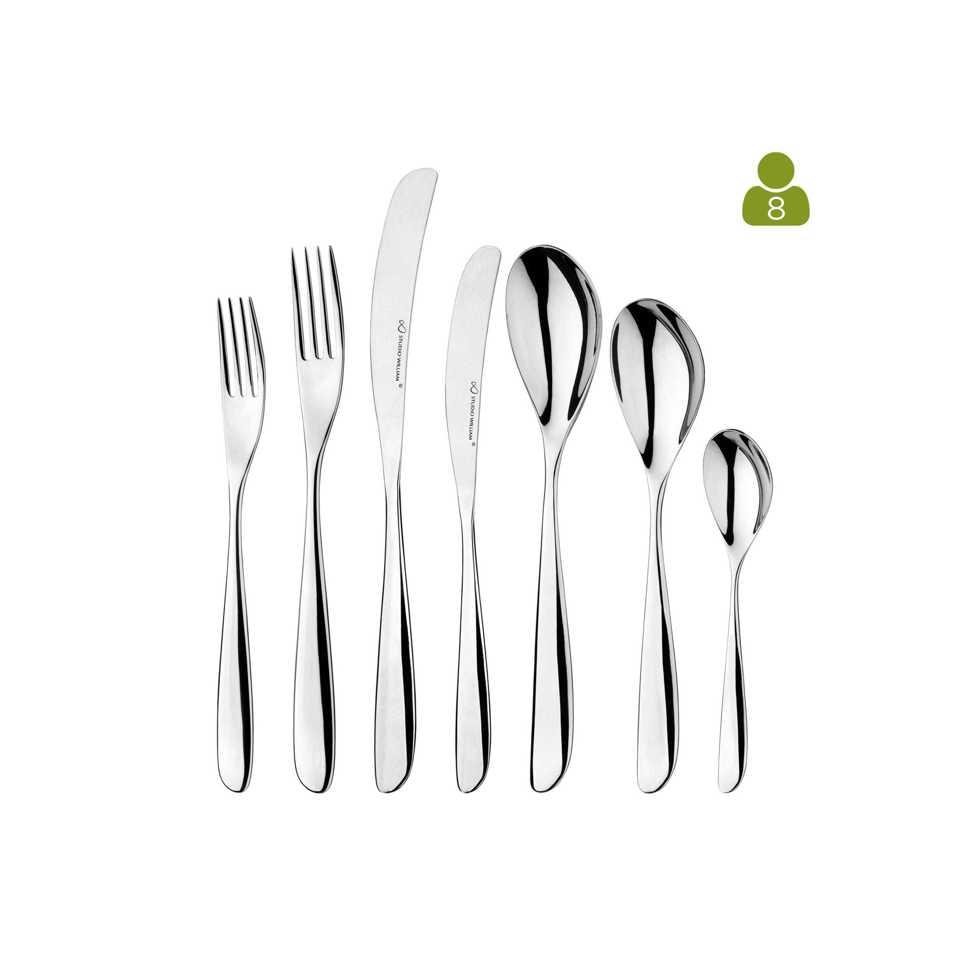Olive Mirror 56 Piece Set consists of 8 x 7 piece place settings (Table Knife, Table Fork, Soup Spoon, Side Knife, Side Fork, Dessert Spoon and a English Teaspoon).
