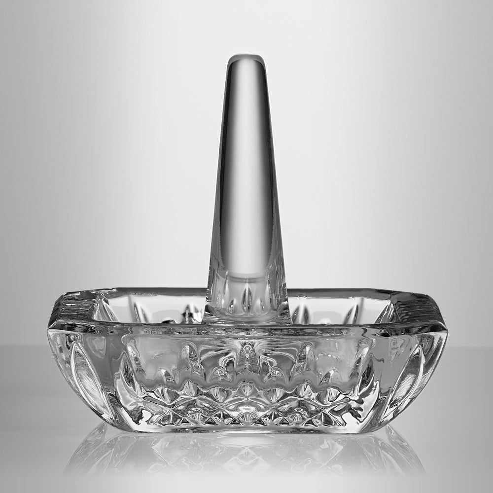 The Waterford Lismore pattern is a stunning combination of brilliance and clarity. Safeguard your wedding, engagement or signet rings with the beautiful Lismore Square Ring Holder. A central spike keeps rings secure, while the lipped fine crystal tray can be used to store cufflinks, earrings or necklaces and is intricately detailed with the dramatic diamond and wedge cuts of the classic Lismore pattern. Waterford's hand-crafted fine crystal guarantees diamond-like clarity and comforting weight and stability.